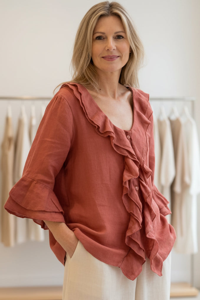 Introducing the Virginia Shirt, a timeless addition to your wardrobe. Made from a soft, breathable polyester blend, it keeps you cool and comfortable, while playful ruffles along the front add a charming touch of style.