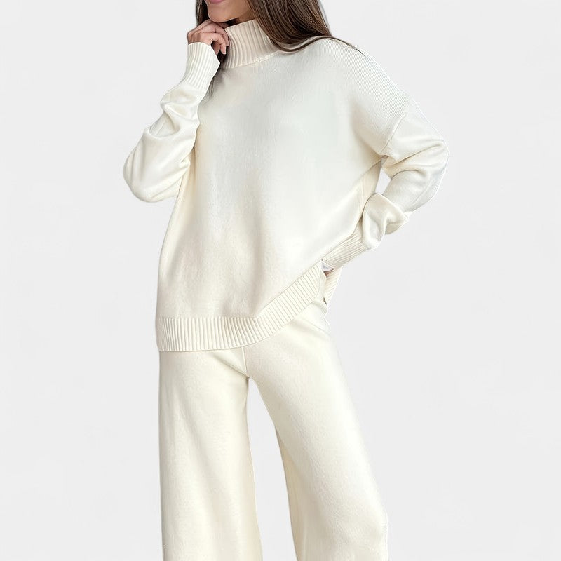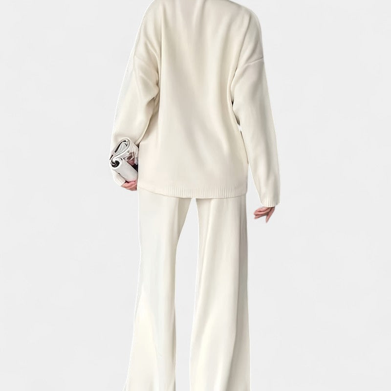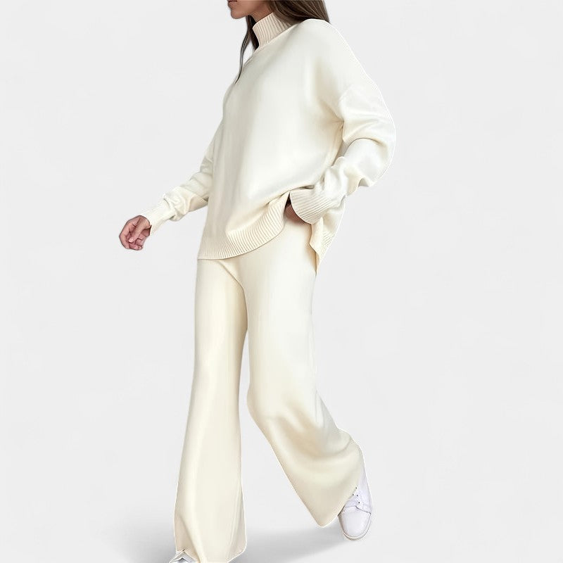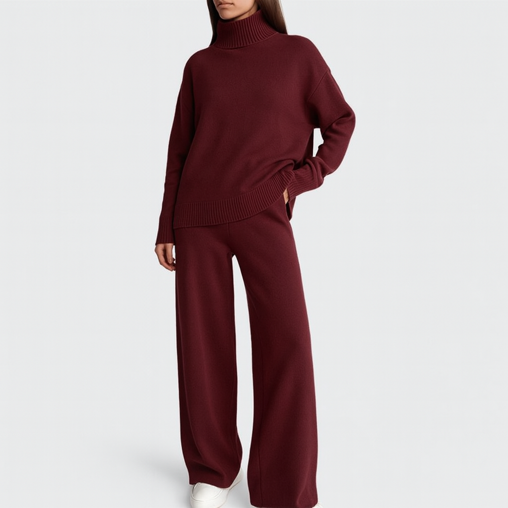 El jersey de cuello alto, de tacto sedoso y corte holgado, aporta un aire moderno y relajado, mientras que los pantalones de pierna ancha se mueven con gracia y comodidad, adaptándose con elegancia a cada paso. Juntos forman un conjunto que eleva el confort a un nivel de auténtico estilo.