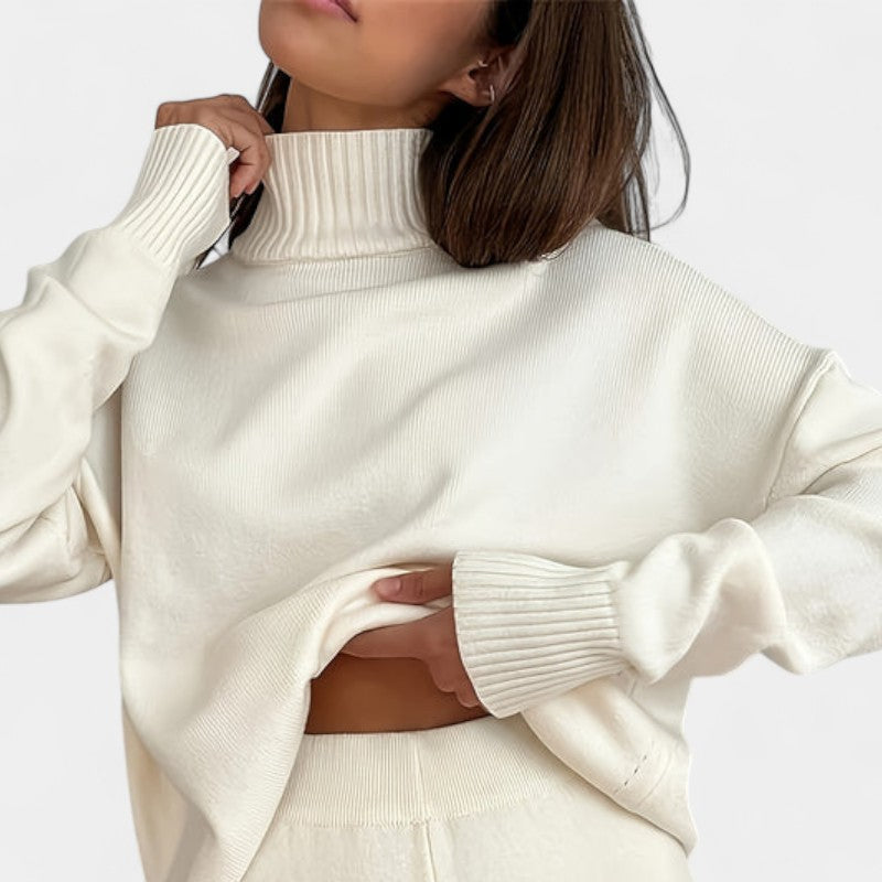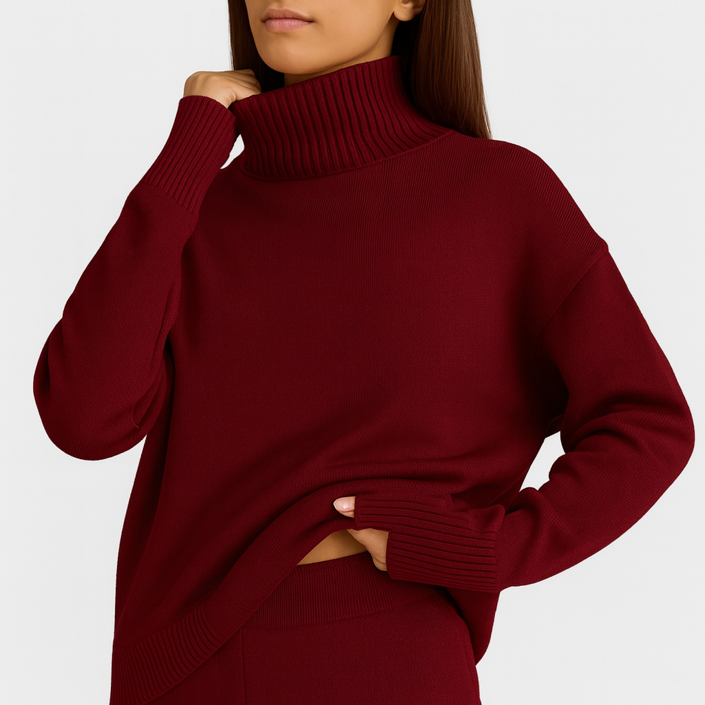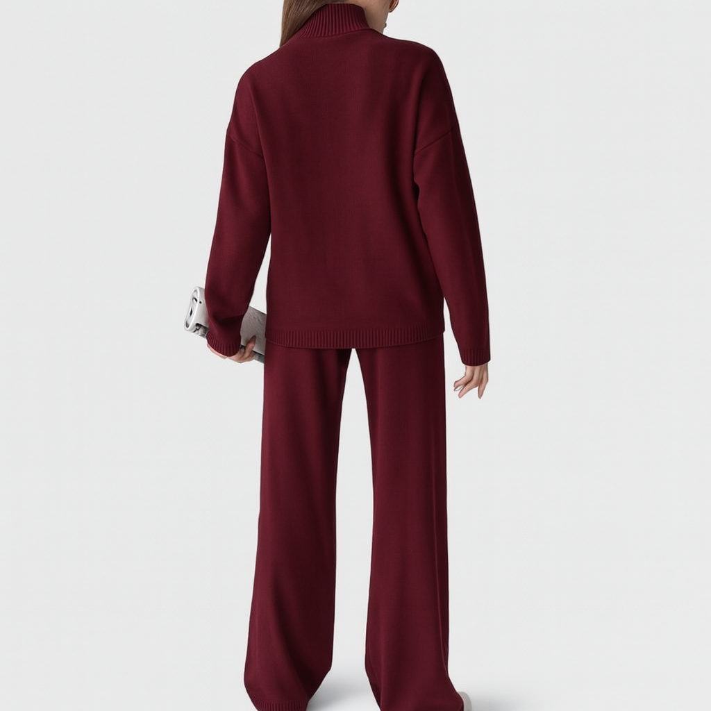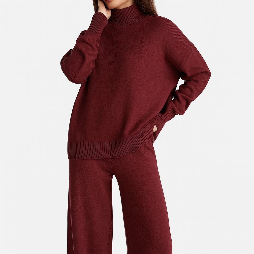 El jersey de cuello alto, de tacto sedoso y corte holgado, aporta un aire moderno y relajado, mientras que los pantalones de pierna ancha se mueven con gracia y comodidad, adaptándose con elegancia a cada paso. Juntos forman un conjunto que eleva el confort a un nivel de auténtico estilo.