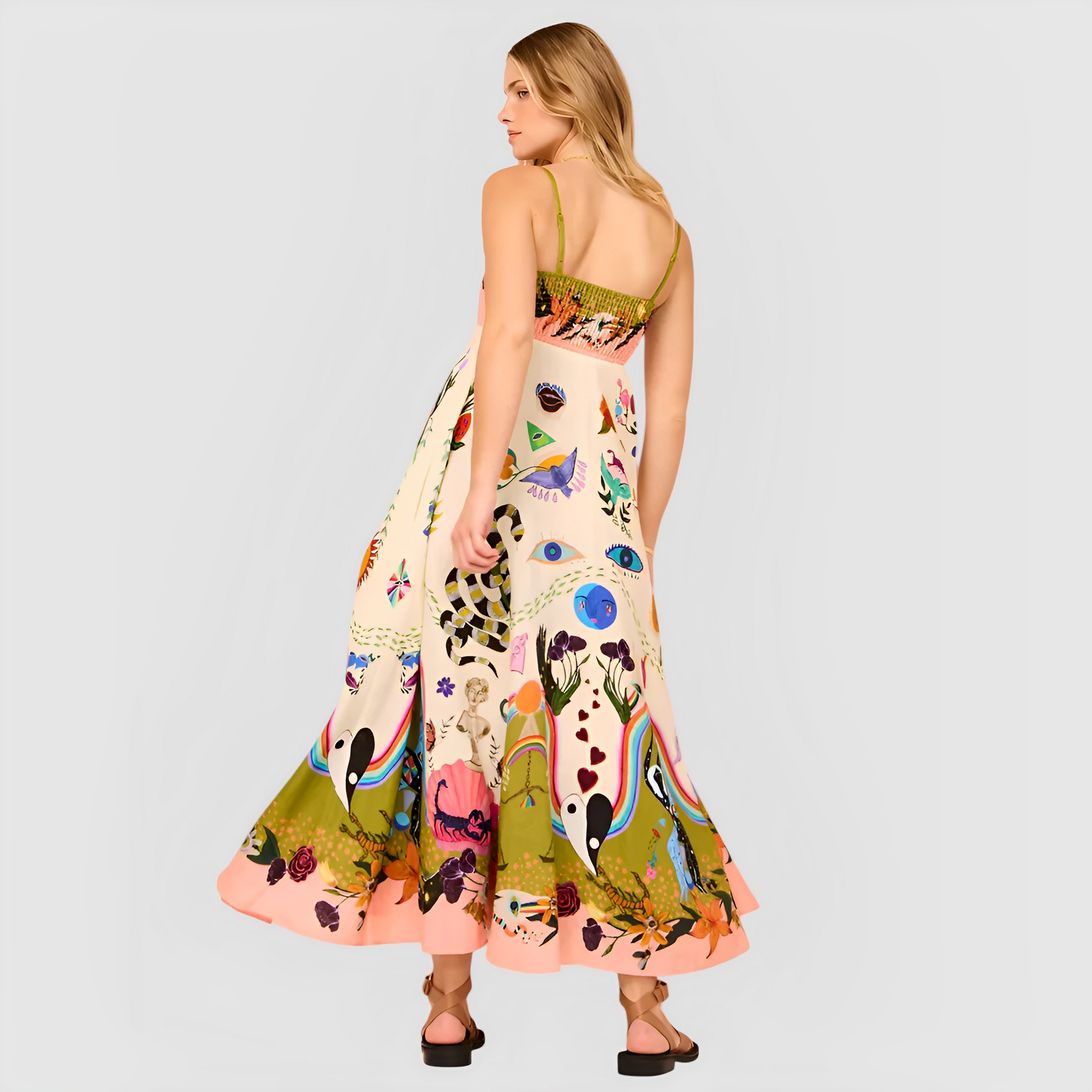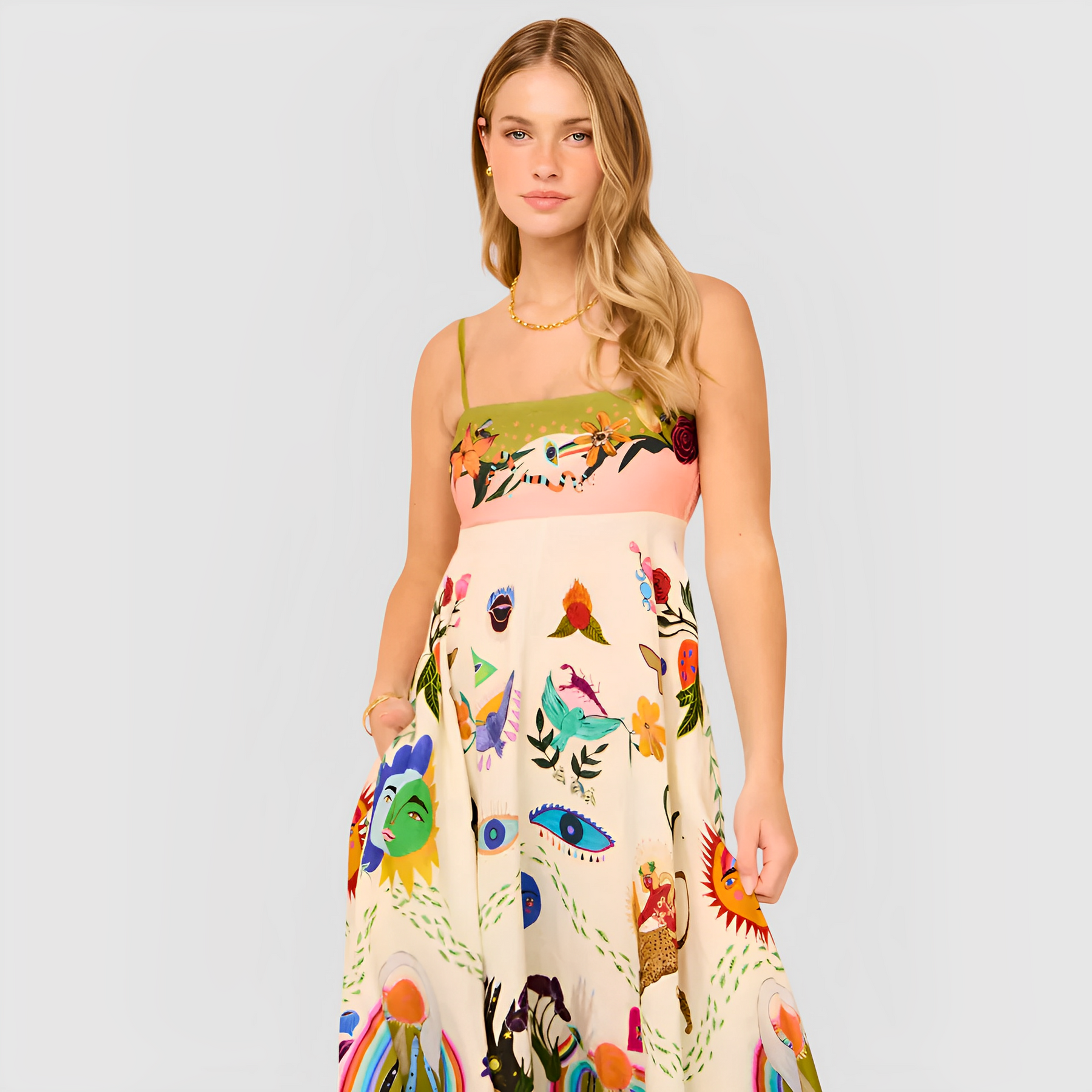 Con un estampado vibrante de inspiración veraniega, "Dulce Destino" atraerá todas las miradas allá donde vayas. Los bolsillos discretos pero funcionales le aportan un toque práctico sin sacrificar estilo, permitiéndote llevar tus esenciales contigo con total comodidad.